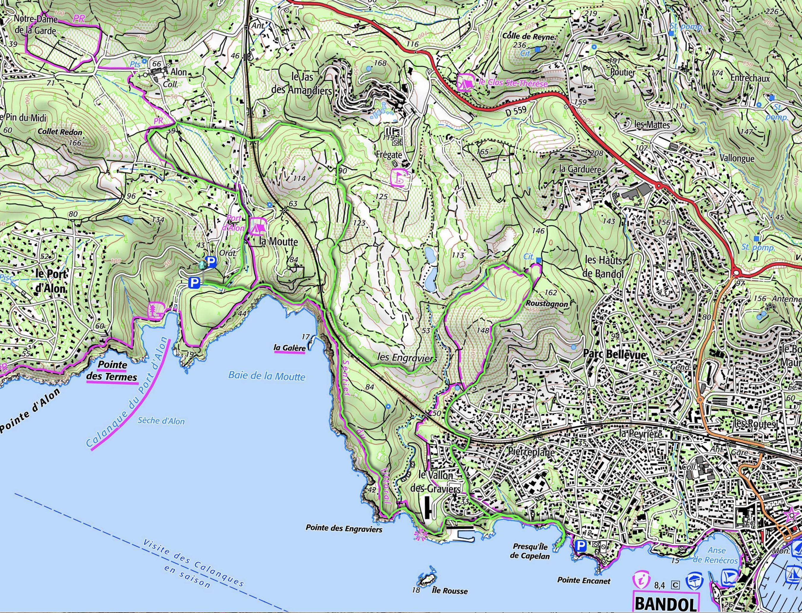 Un petit détour par le massif du Roustagnon et le moment sera venu de descendre jusqu'à la mer par les faubourgs de Bandol. Après une petite incursion jusqu'à la presqu'île de Capelan (à ne pas confondre avec la plage des Catalans !), nous reviendrons à notre point de départ par le sentier du littoral où nous pourrons admirer les paysages maritimes caractéristiques de notre région. Nous choisirons l'une des criques rencontrées en chemin pour satisfaire la faim qui n'aura pas manqué de se rappeler à nous.