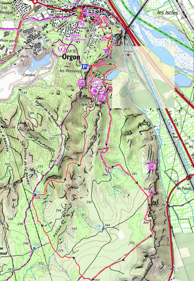 Depuis le village d'Orgon, et plus précisémment depuis le parking du musée d'Orgon, ascension de la colline pour atteindre l'église Notre Dame de Beauregard, en passant devant les ruines du château du Duc de Guise. Panorama exceptionnel sur la vallée de la Durance, le mont Ventoux et le Luberon.
