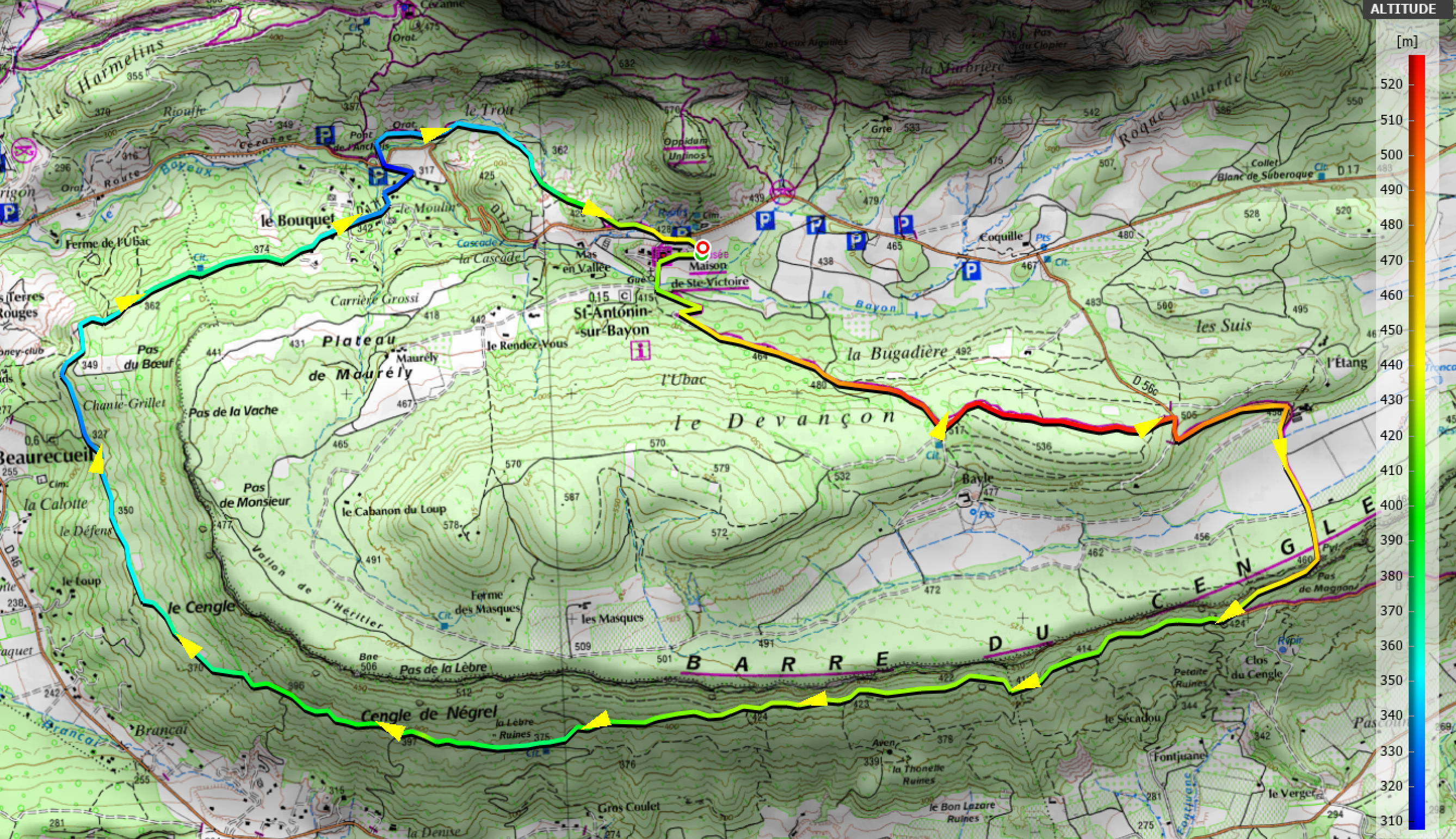 Depuis la Maison de la Ste Victoire, nous traverserons la forêt du Dévançon pour rejoindre la route D56c que nous longerons sur 1km pour descendre le plateau. Après le Pas de Magnan nous prendrons la piste qui longe le pied de la falaise de la Barre du Cengle. La piste nous amènera au hameau du Bouquet et rentrerons par le sentier dans le vallon du Trou, seul passage avec quelques raidillons.