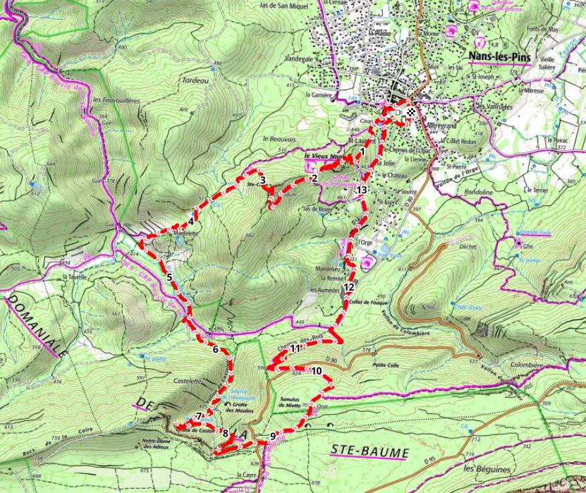 Depuis le parking public au centre ville, traversée du village en passant devant la chapelle de la Miséricorde édifiée en 1626, point de départ pour les pèlerinages à la Sainte Baume.